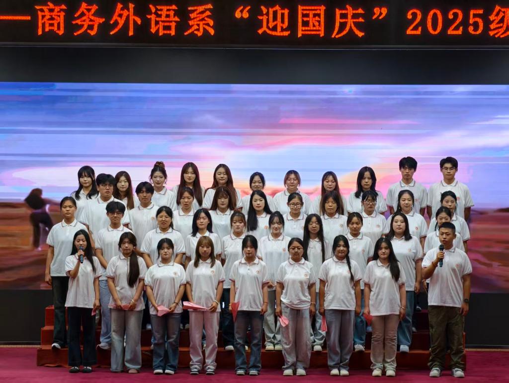 2025年9月29日晚,商务外语系在图书馆学术报告厅举办“山河颂,青春歌——商务外语系‘迎国庆’2025级新生班歌大赛”,商务外语系党总支书记刘永美、副主任昌利娜、全体辅导员、2025级班主任担任评委,全体新生班级参与了此次比赛。